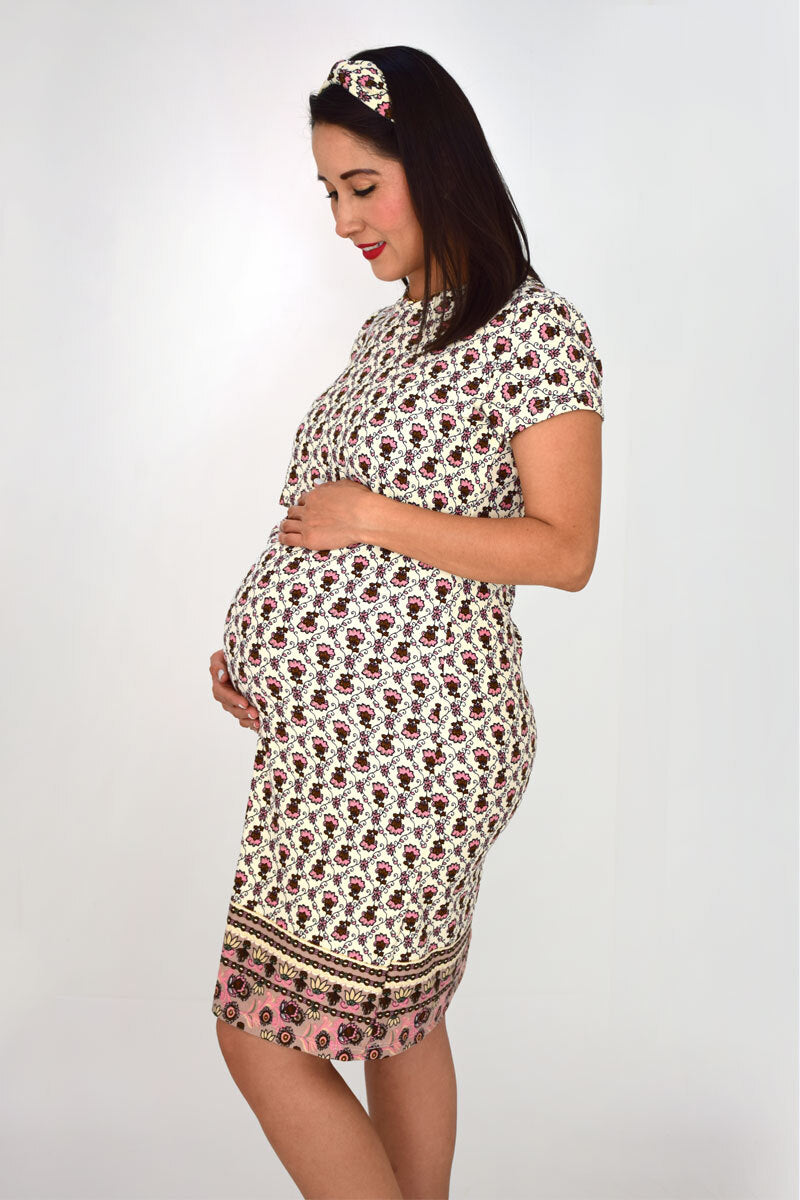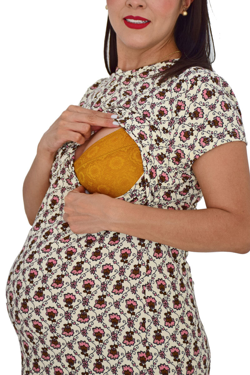 Presume tu pancita con el hermoso camisón de EMMA (Ropa de embarazo y lactancia) estampado de flores que podrás vestir también después de tener a tu bebé para alimentarlo fácilmente con su sistema de lactancia súper cómodo.